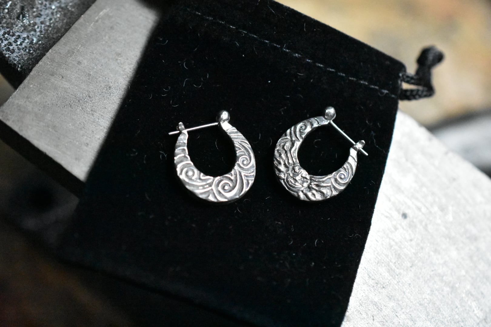 ◆silver 925製、太陽と月のデザインが施されたフープピアスです。