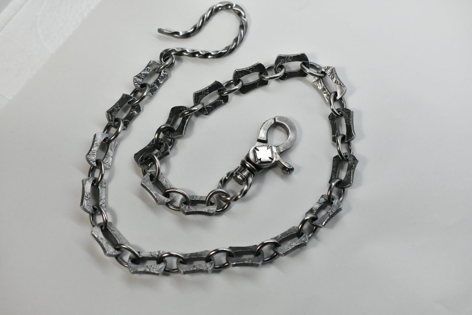 エンドパーツには鍛金技法にて叩き出しで製作しているツイストフックとオリジナルデザインアイアンクロスナスカンを使用しています。
